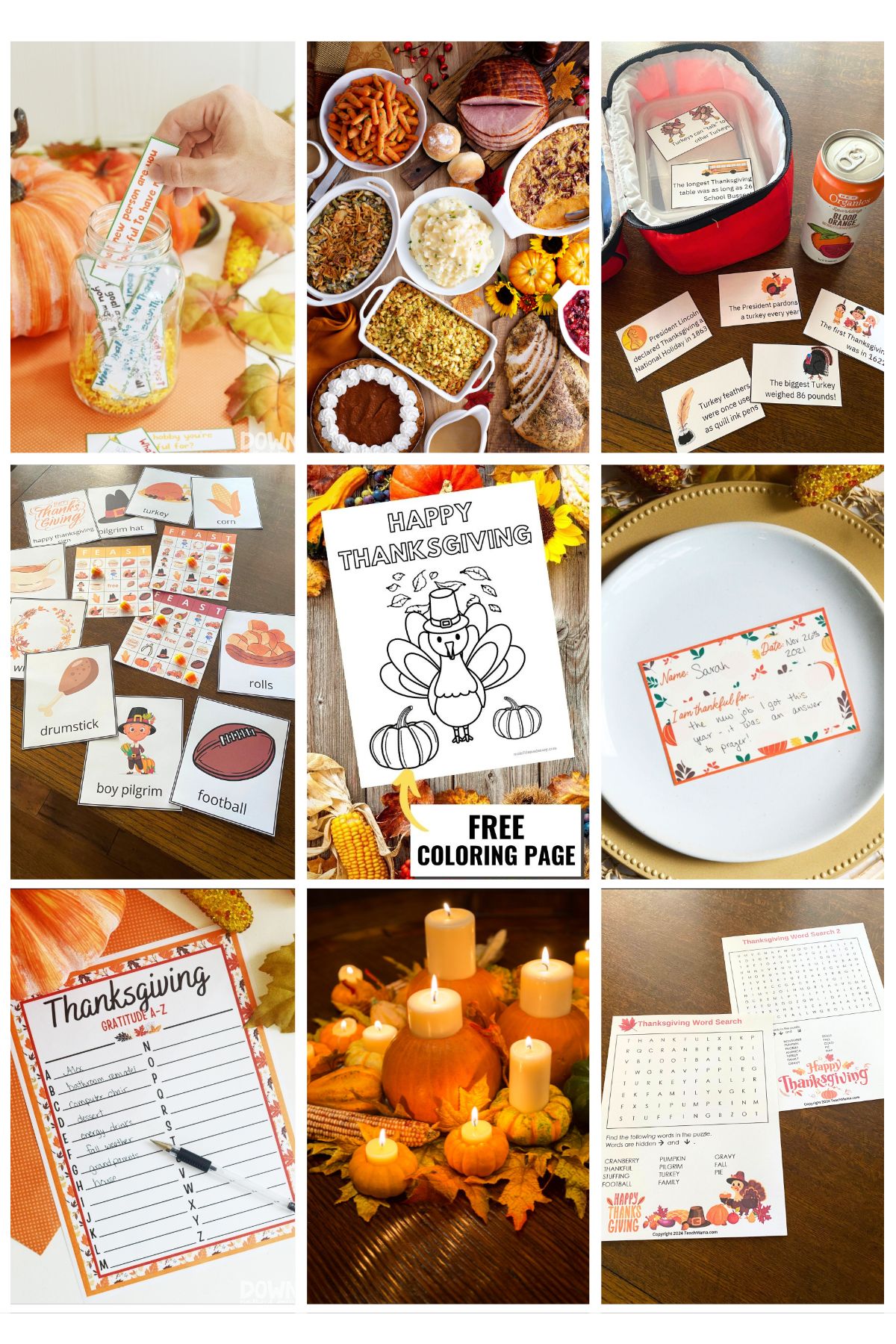 9 square grid with images of Thanksgiving printables